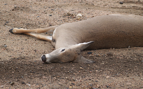 The walkers did not see the deer come to the road and attempt to cross. But they did see the truck that hit her, they did hear the thumping sound of the collision, and they did feel the shock of violent death. The walkers found the deer lying by the side of the road, breathing her last breath after having been hit. There were no tracks to show which direction she had come from, or where she was headed. The truck went on. The dying deer and the walkers remained.